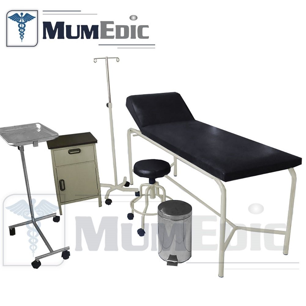• Camilla de examinación, coche de curaciones, taburete giratorio, mesa de mayo, portasueros, basurero.