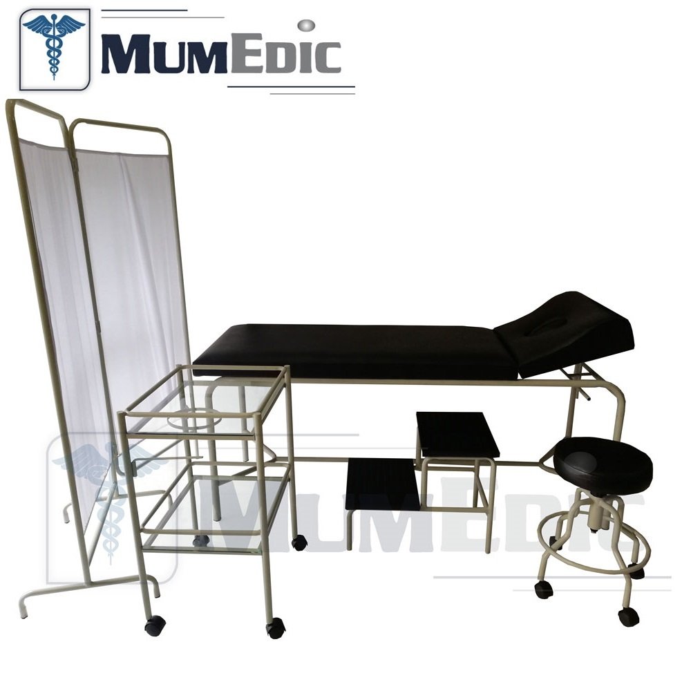 • Camilla de examinación, biombo de 2 hojas, coche de curaciones, gradilla de 2 peldaños, taburete giratorio.